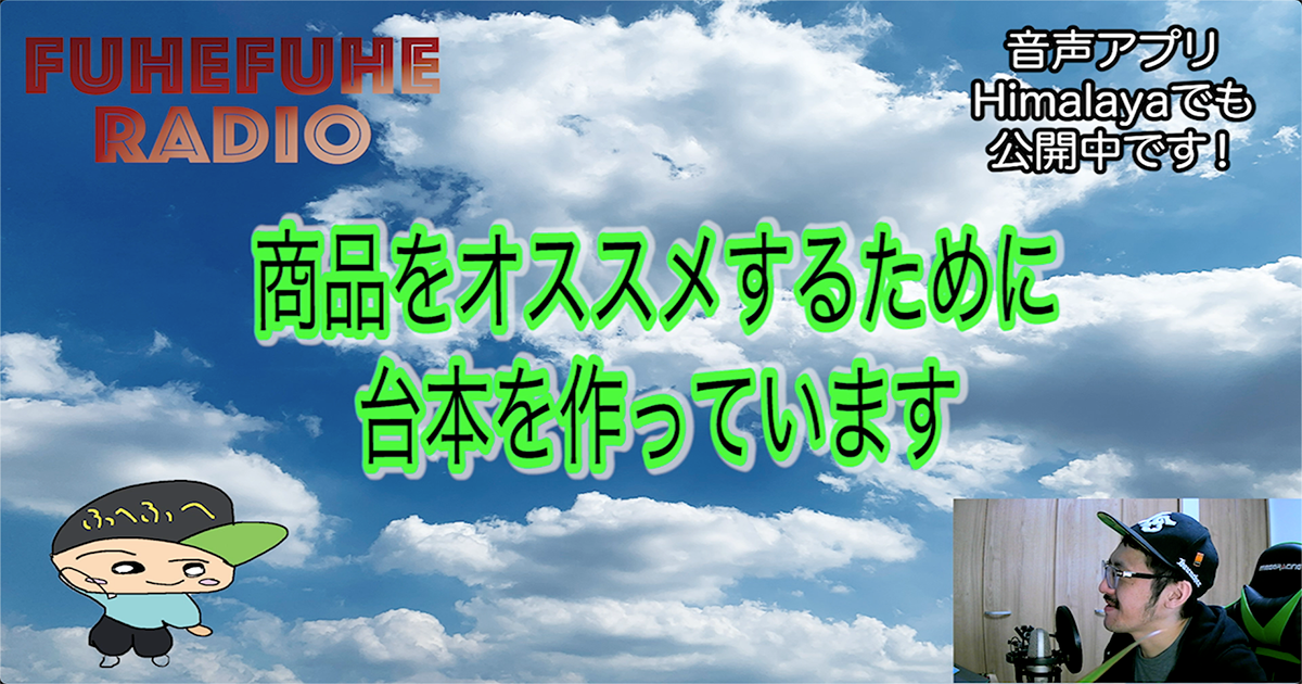カテゴリー: youtube/全て/日記 商品をオススメするために台本を作っています 投稿日: 2021年3月10日2021年3月10日 作成者: fuhefuheコメント 先日、Amazonのオーディブルというものをオススメして、報酬をもらおうというお話をしました。 めちゃくちゃざっくりの説明で申し訳ない! 今回は商品を売るためには商品のことを知らないと売れないよね。というお話になります。 […] 続きを読む
